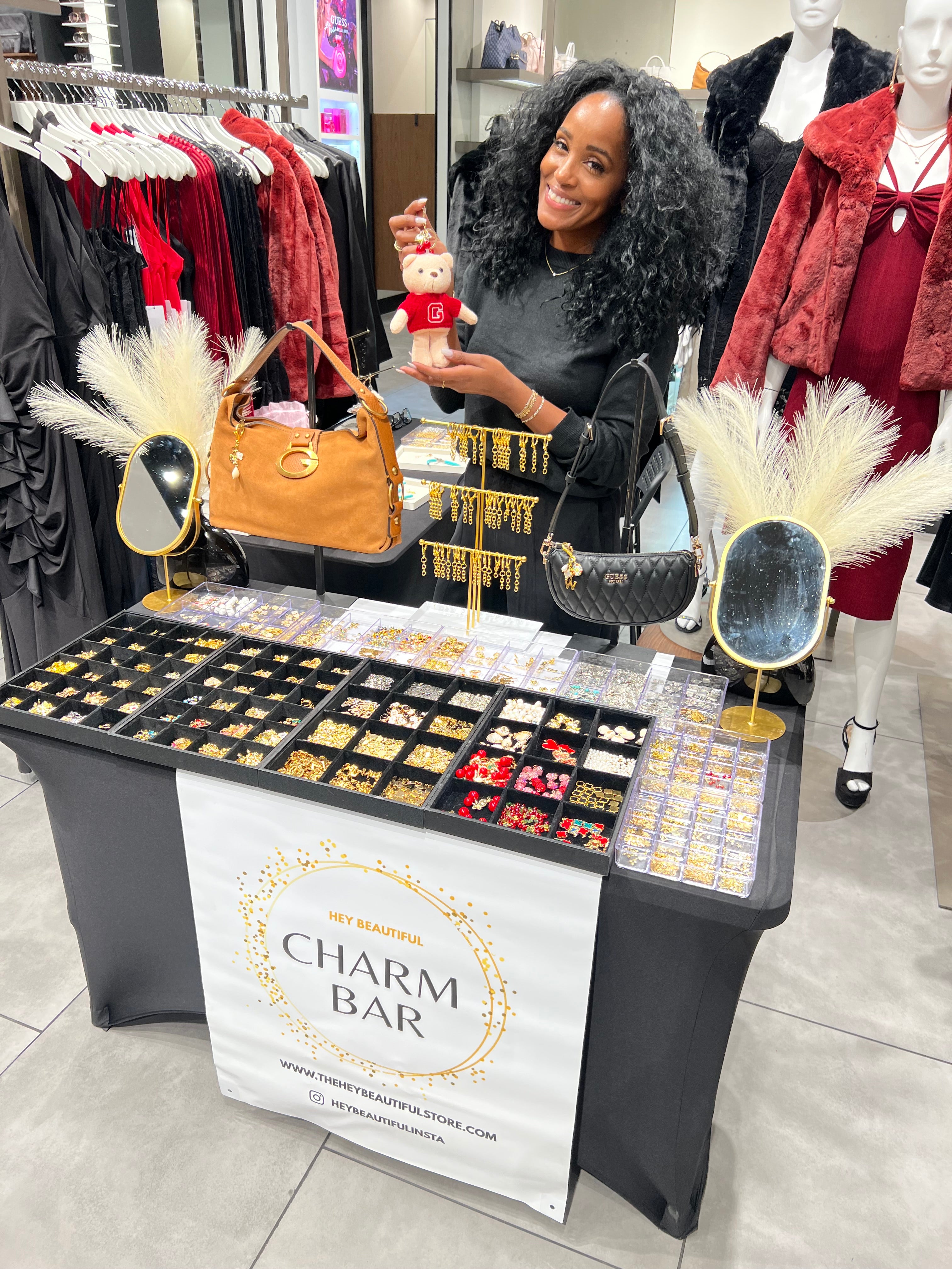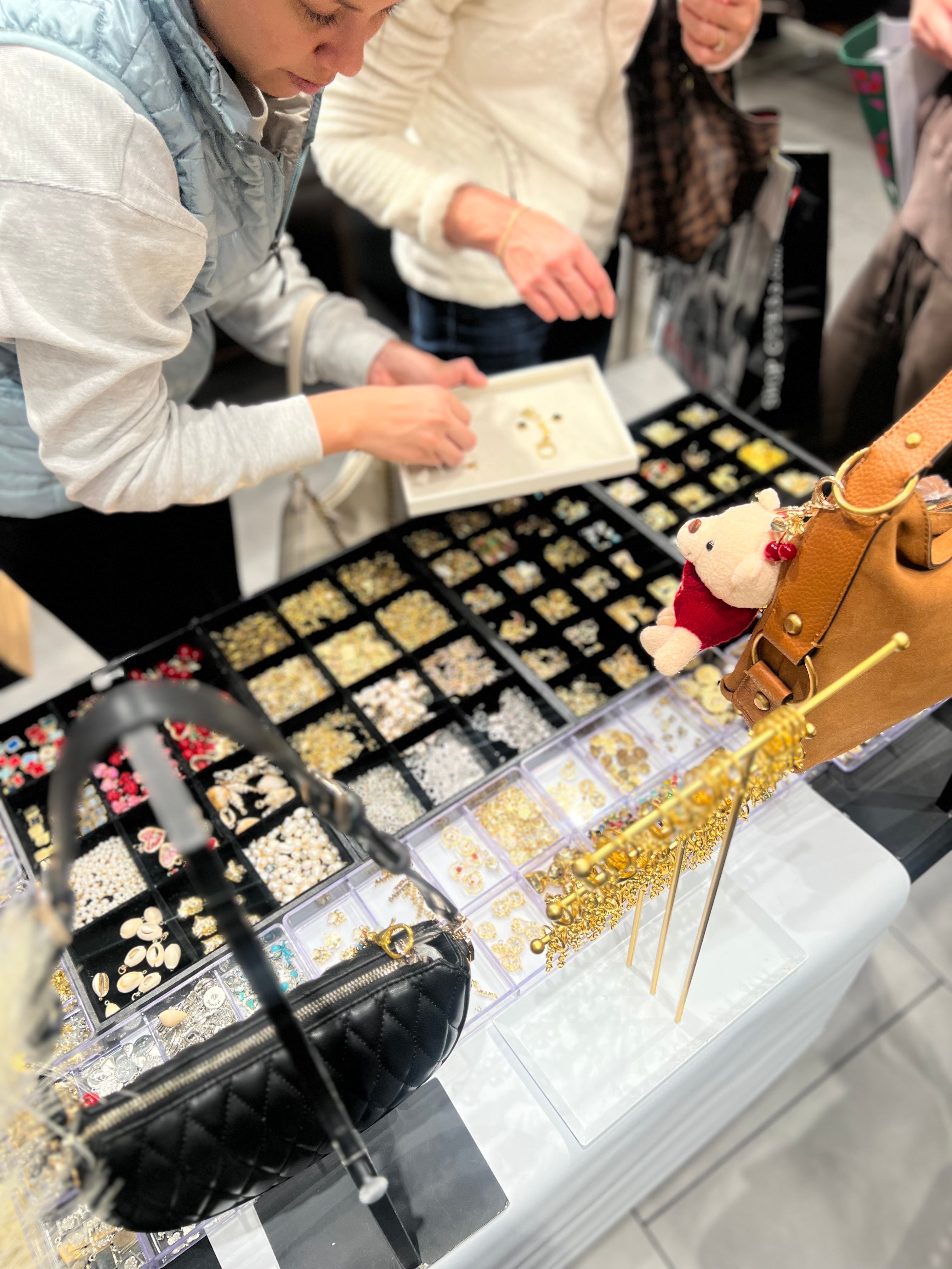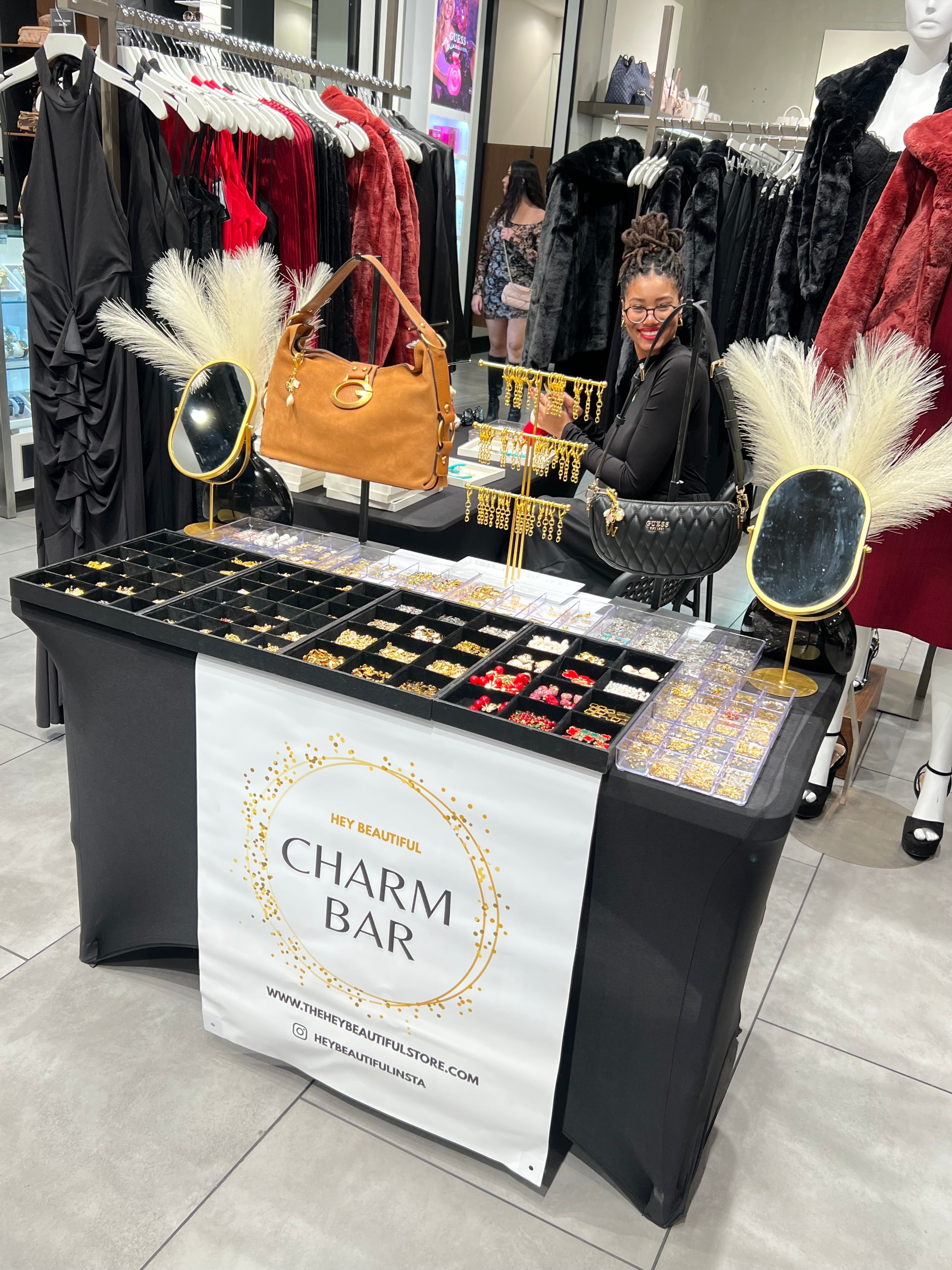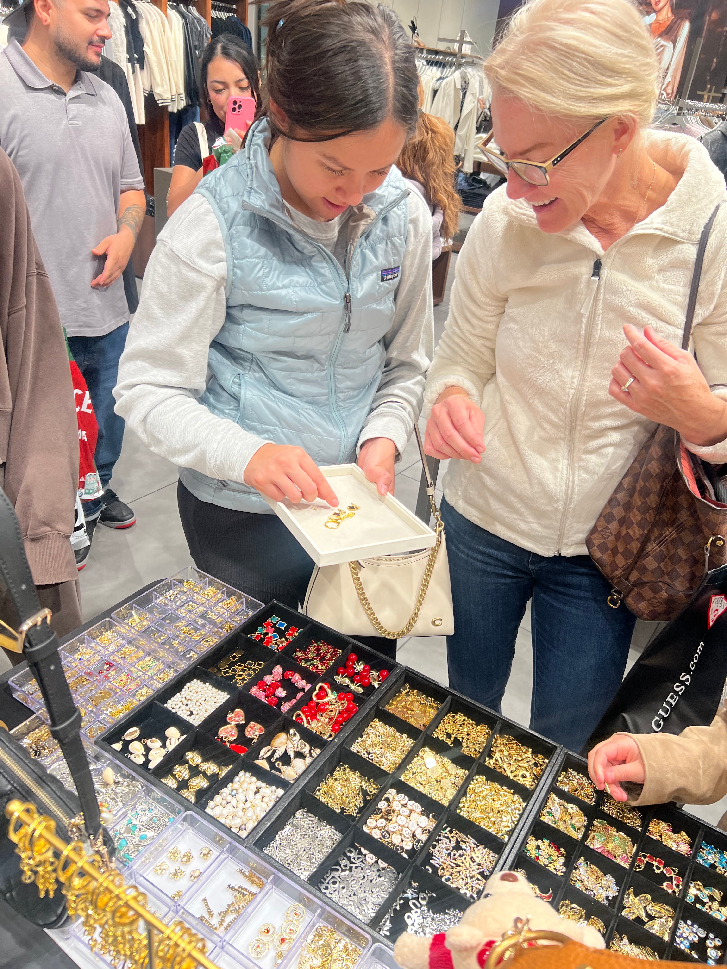 A charm bar activation for a GUESS guest appreciation event, offering complimentary custom charms with qualifying purchases of $150 or more.