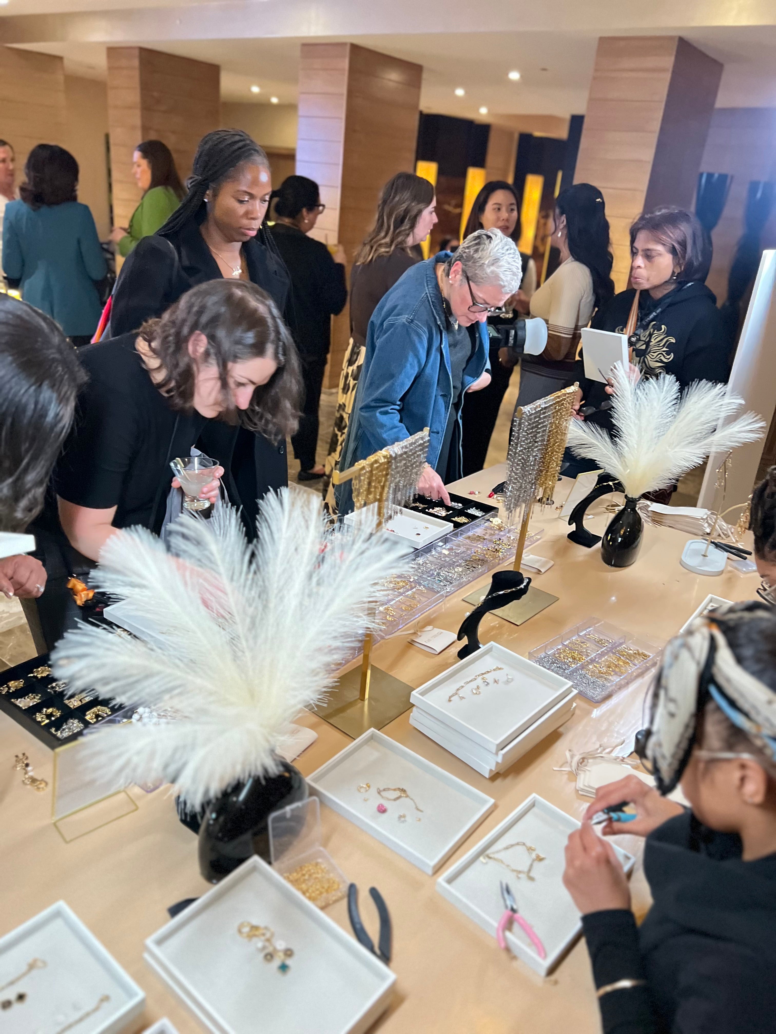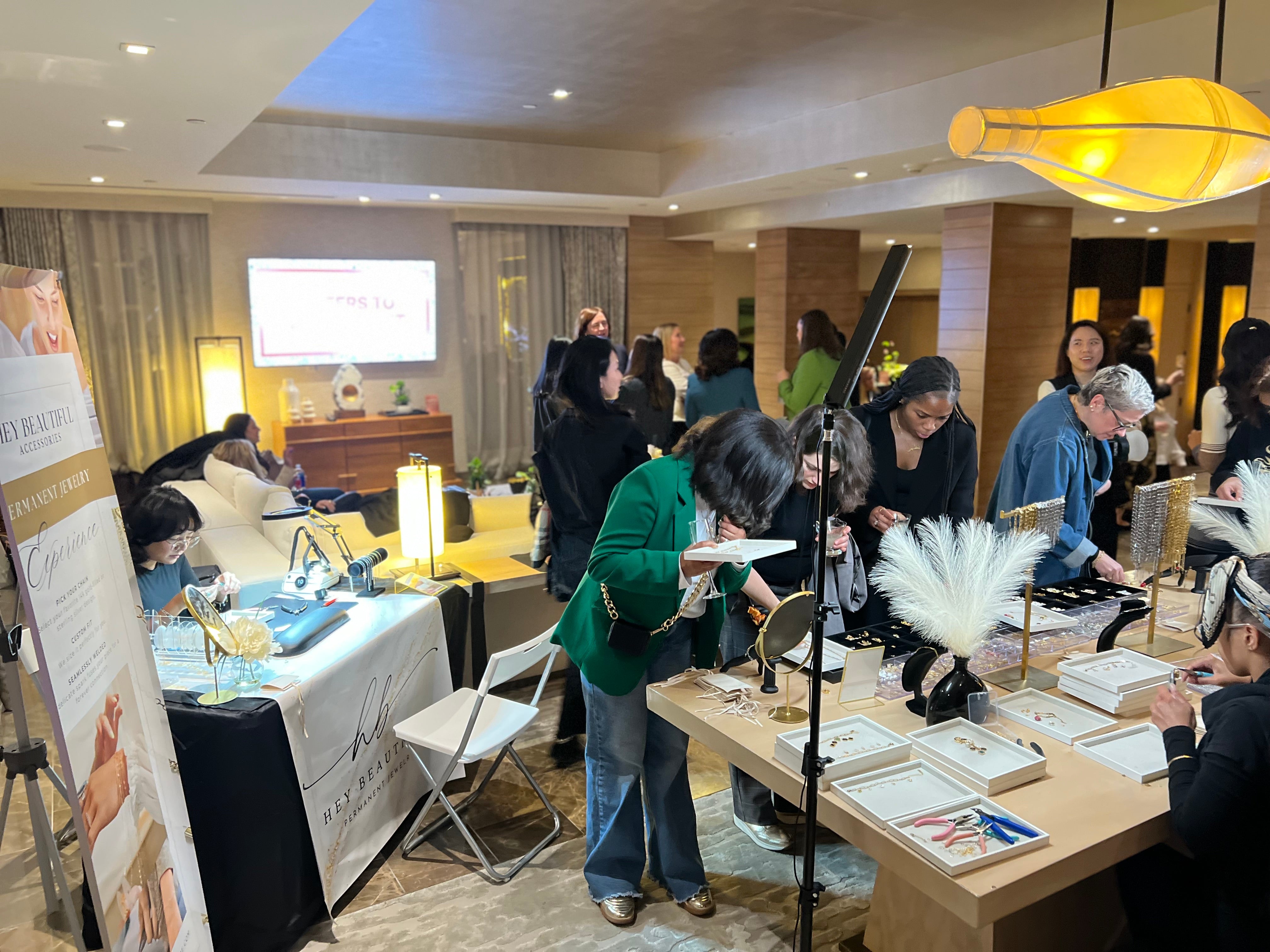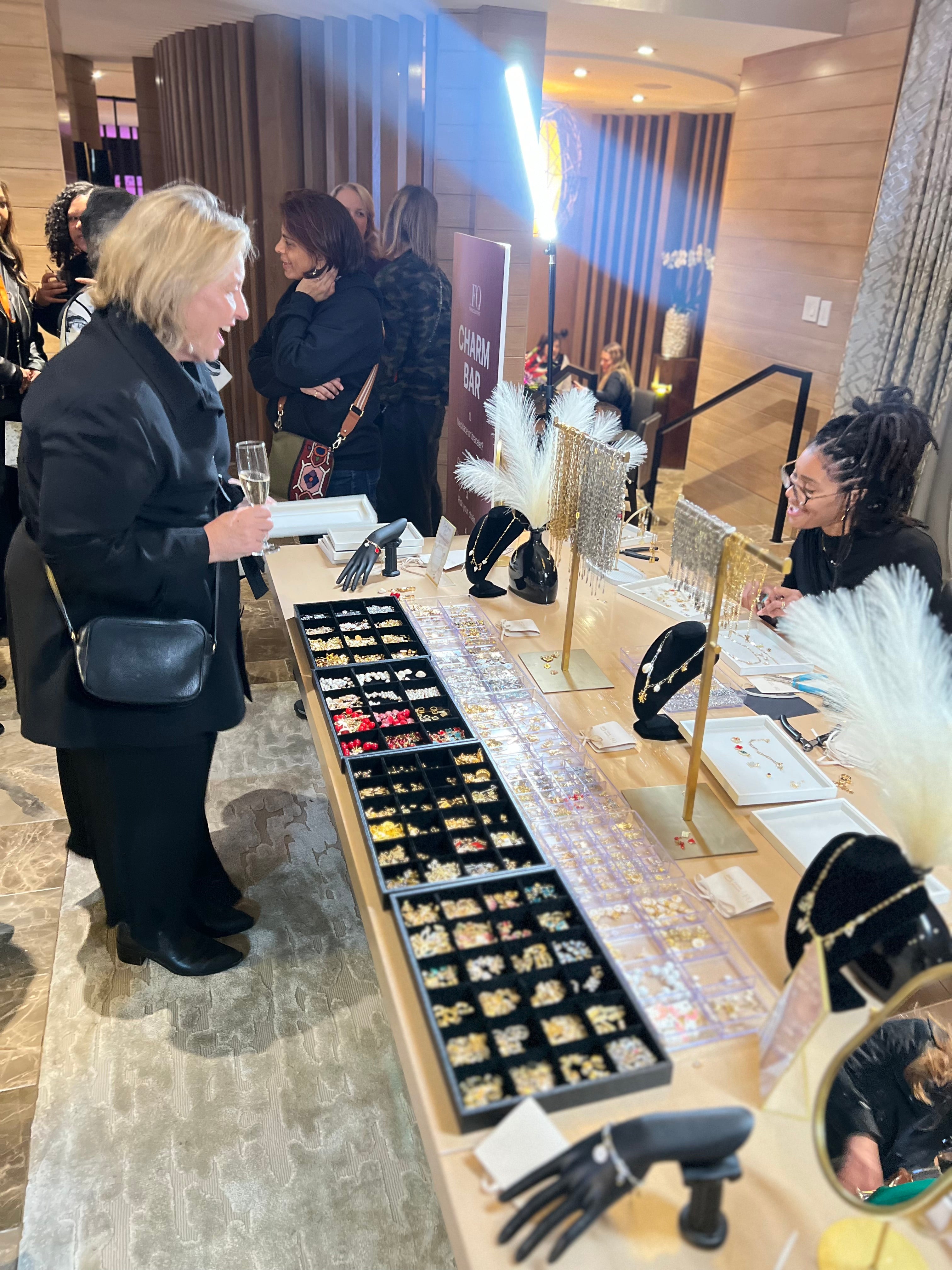 A premium lounge activation inside a private suite partnered with Amazon Web Services, featuring a charm bar and on-site permanent jewelry experience for guests.